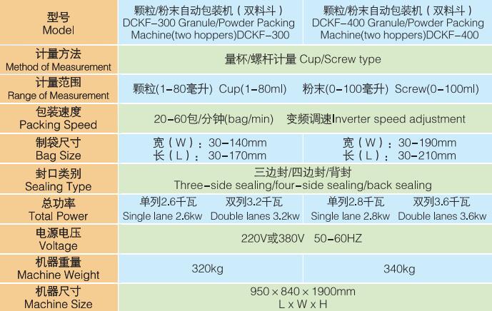 您的位置:首頁 > 產(chǎn)品展示 > 顆粒自動包裝機 > DCKF-300-1/DCKF-300-2三邊封/四邊封顆粒粉末兩用背封包裝機技術(shù)參數(shù):